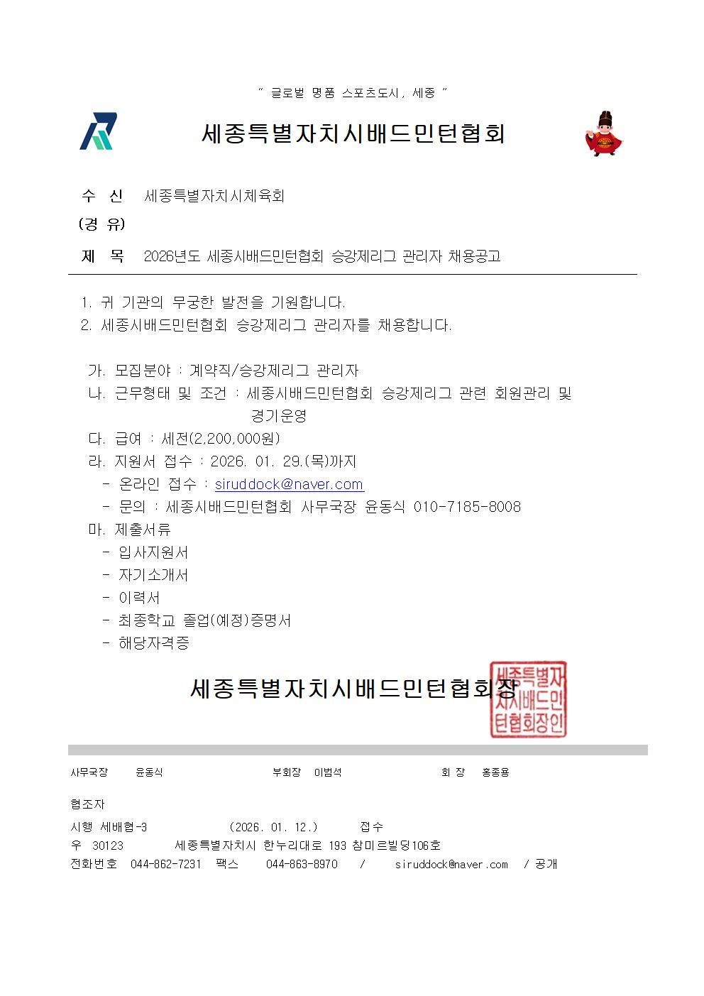 자세한 사항은 세종시배드민턴협회 사무국장 윤동식(010-7185-8008)으로 문의해주시기 바랍니다.